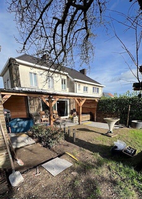 Project te Aalst: Op maat gemaakte overkapping met geïntegreerd sfeer verlichting. Terras met een mooi houten beschutting.